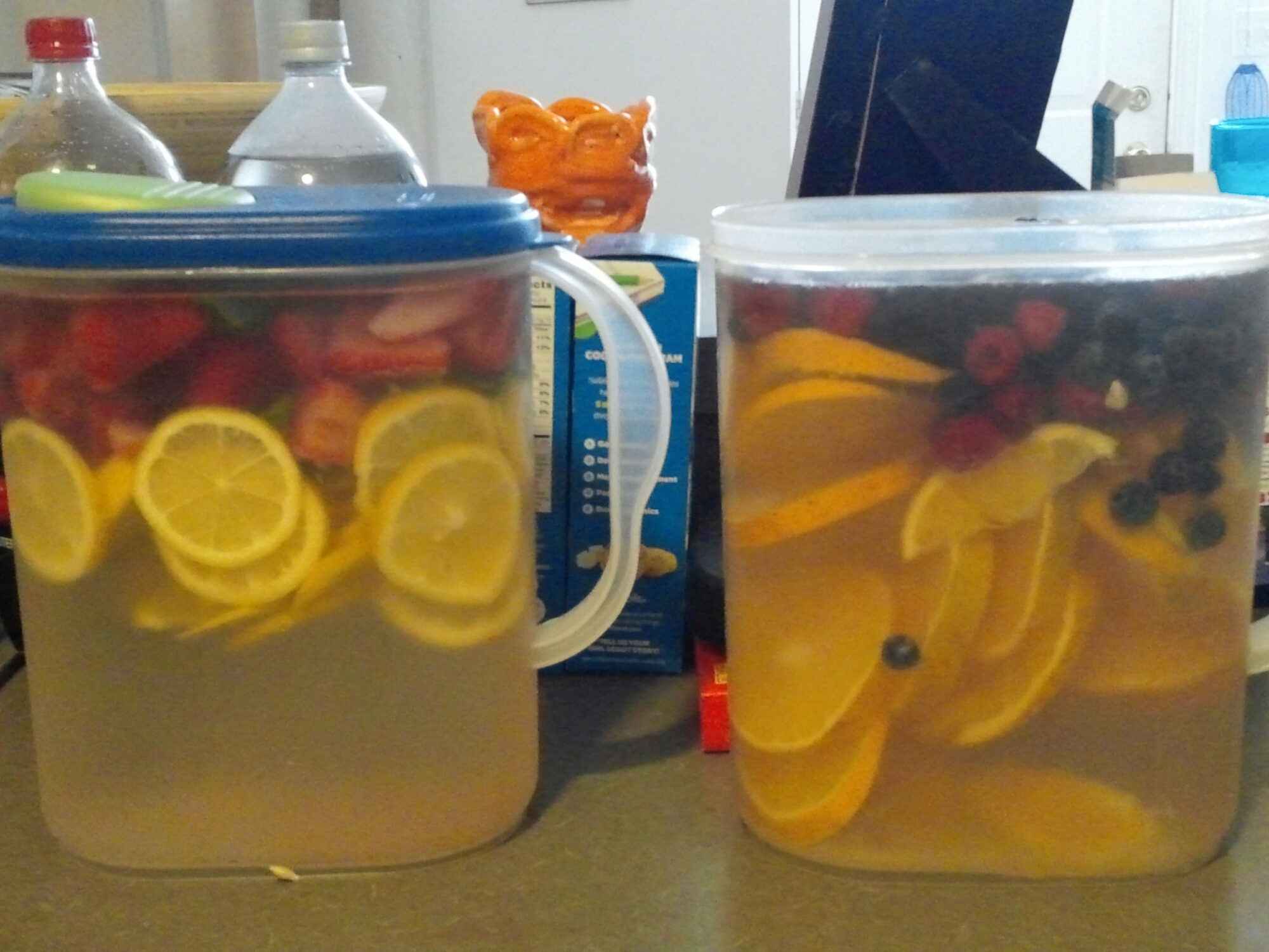 Remember my changes I talked about. I’m getting back into shape, so I began researching things I can use to even out my bartending. Homemade flavored water! This stuff is awesome, and with the heat it helps cool you off around the grill!