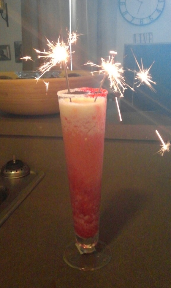 Yes. Sparklers. Why not? Lol. The red layer is strawberries, the blue is a blue caracao and rum mix, and the white is pina coloda. The glass is rimmed with red, white, and blue sugar! Yes, I went all out, and it was tasty!