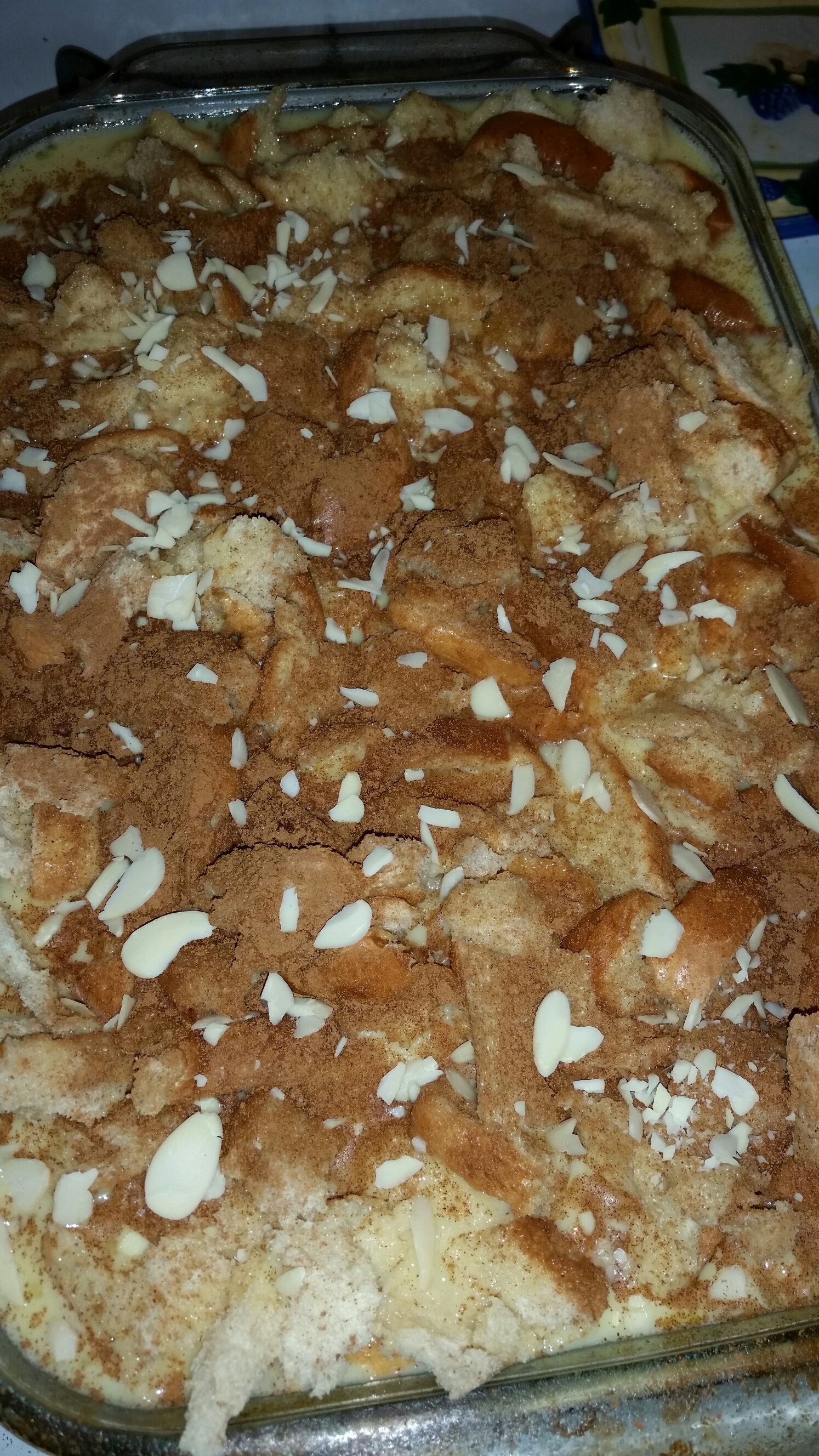 Use the same bowl to beat the eggs. Stir in sugar and vanilla until sugar is dissolved. Slowly whisk in he hot milk. Whisk in egg nog. Pour egg nog mixture over bread cubes. Sprinkle with remaining cinnamon and almonds. Set aside for 5 minutes for bread to soak in mixture for at least 5 minutes.