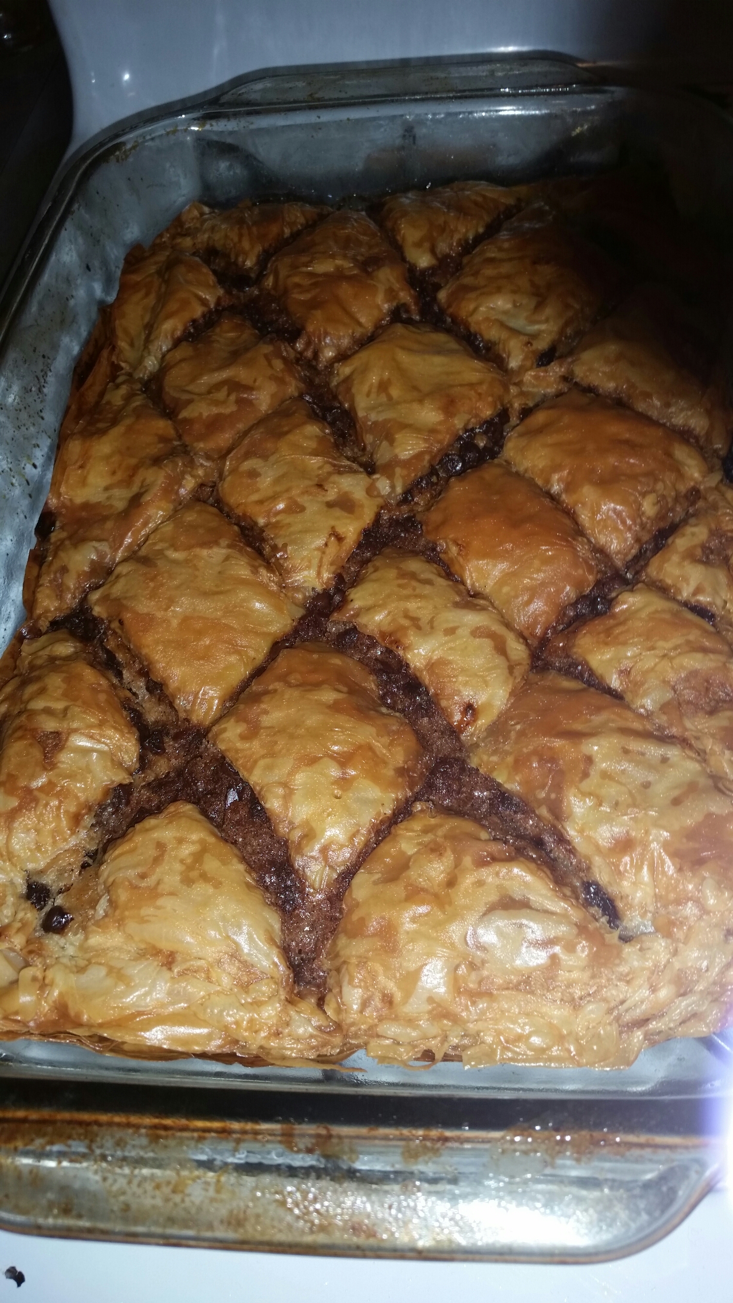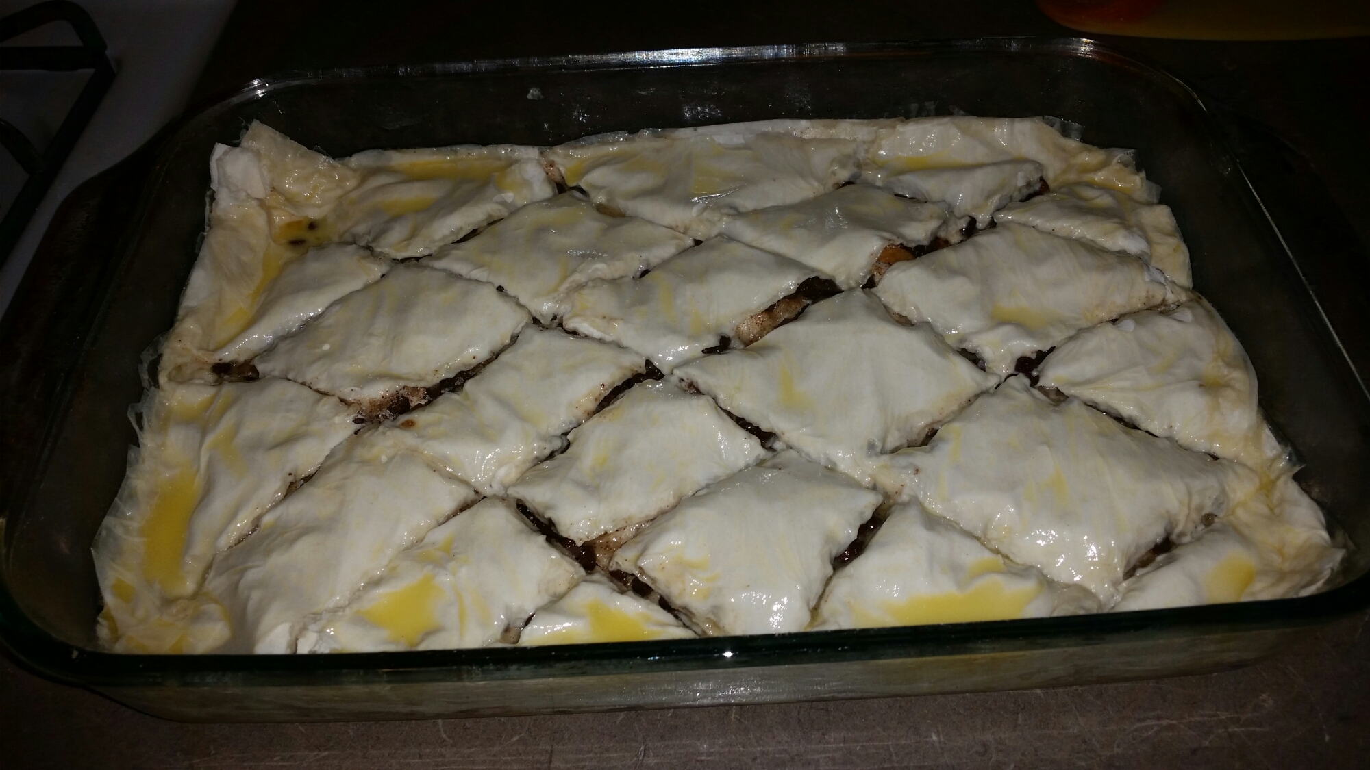 It was real simple. I greased my glass baking pan with coconut oil spray. I took the first layer of dough(8 sheets) and brushed my melted butter on the dough. I added the chocolate layer. It was made up of mini chocolate chips, sugar, cinnamon, lemon zest and walnuts. You continue to do that, but the next layer and going forward, it’s four dough sheets. dough, butter, chocolate mix.