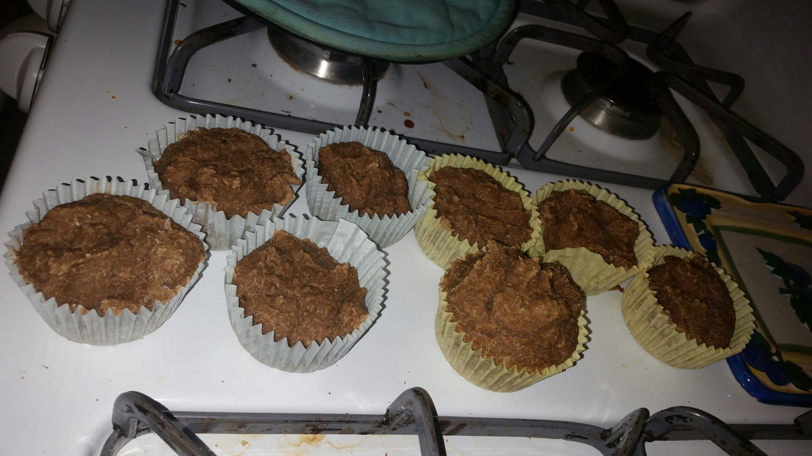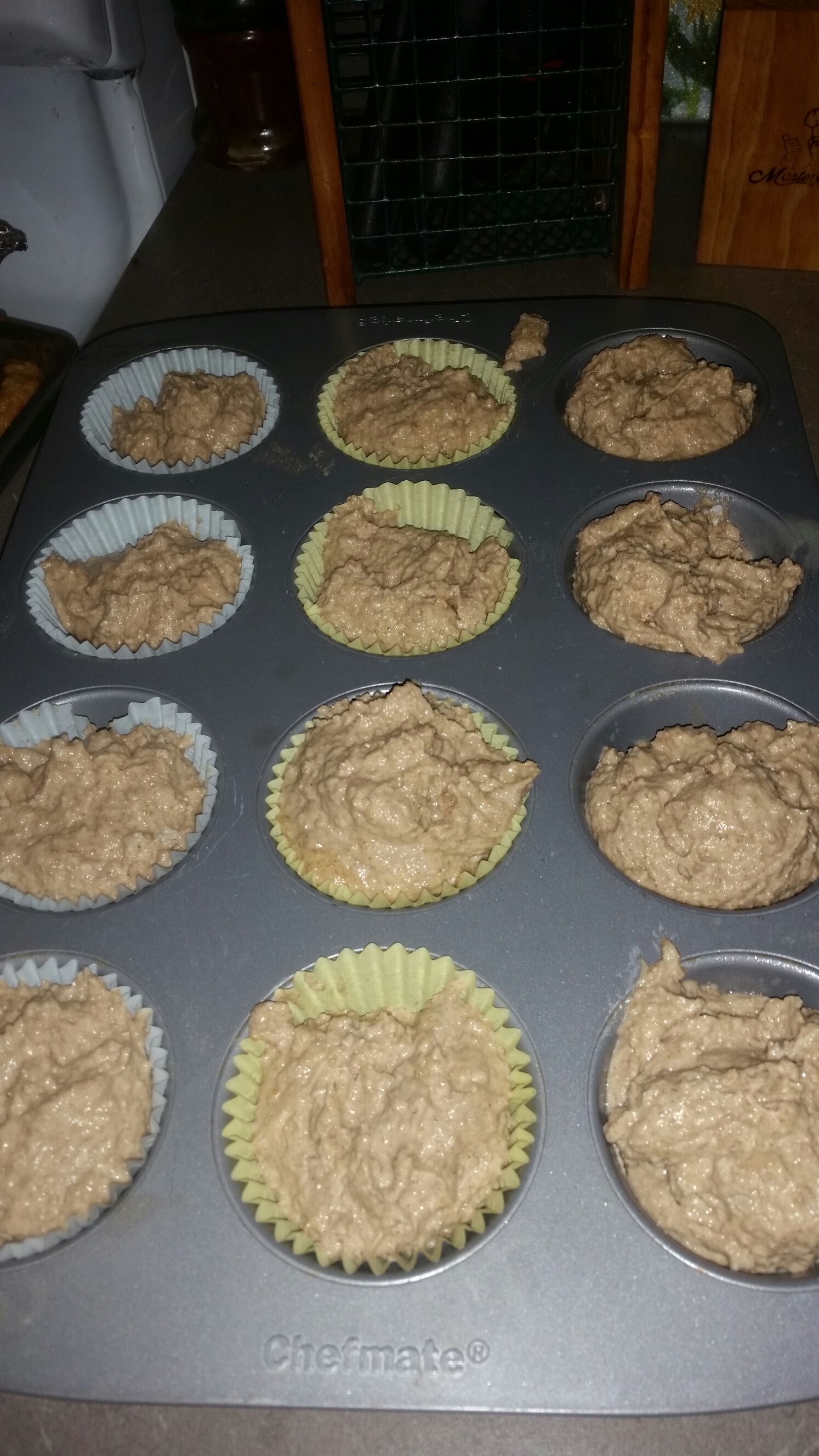 After that, I added 2 eggs, and 4 cups of flour. Mixing all that, we baked them in my muffin pan.
