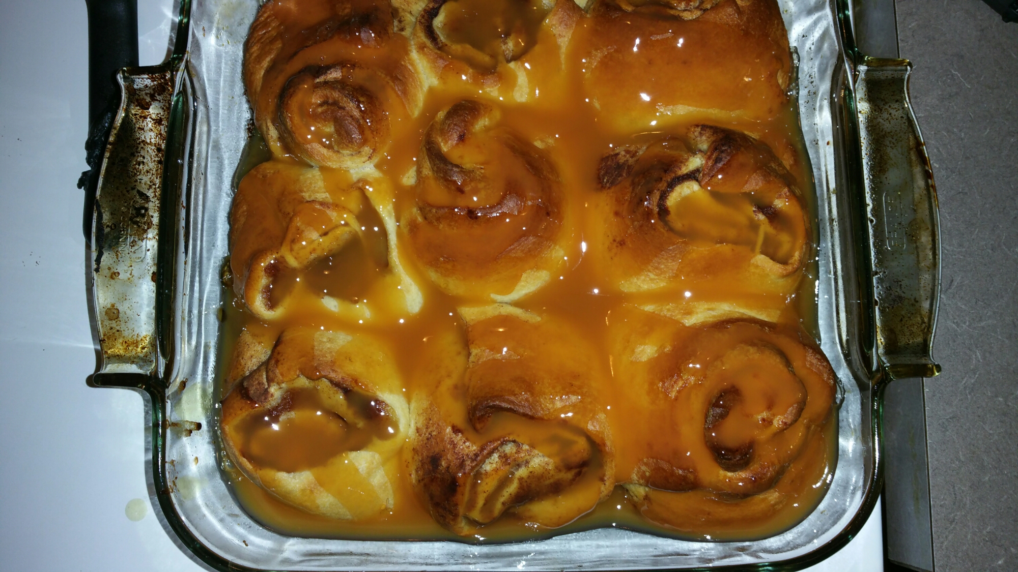 7. Drizzle the caramel sauce after pulling buns out of oven. Serve with ice cream or whipped cream.