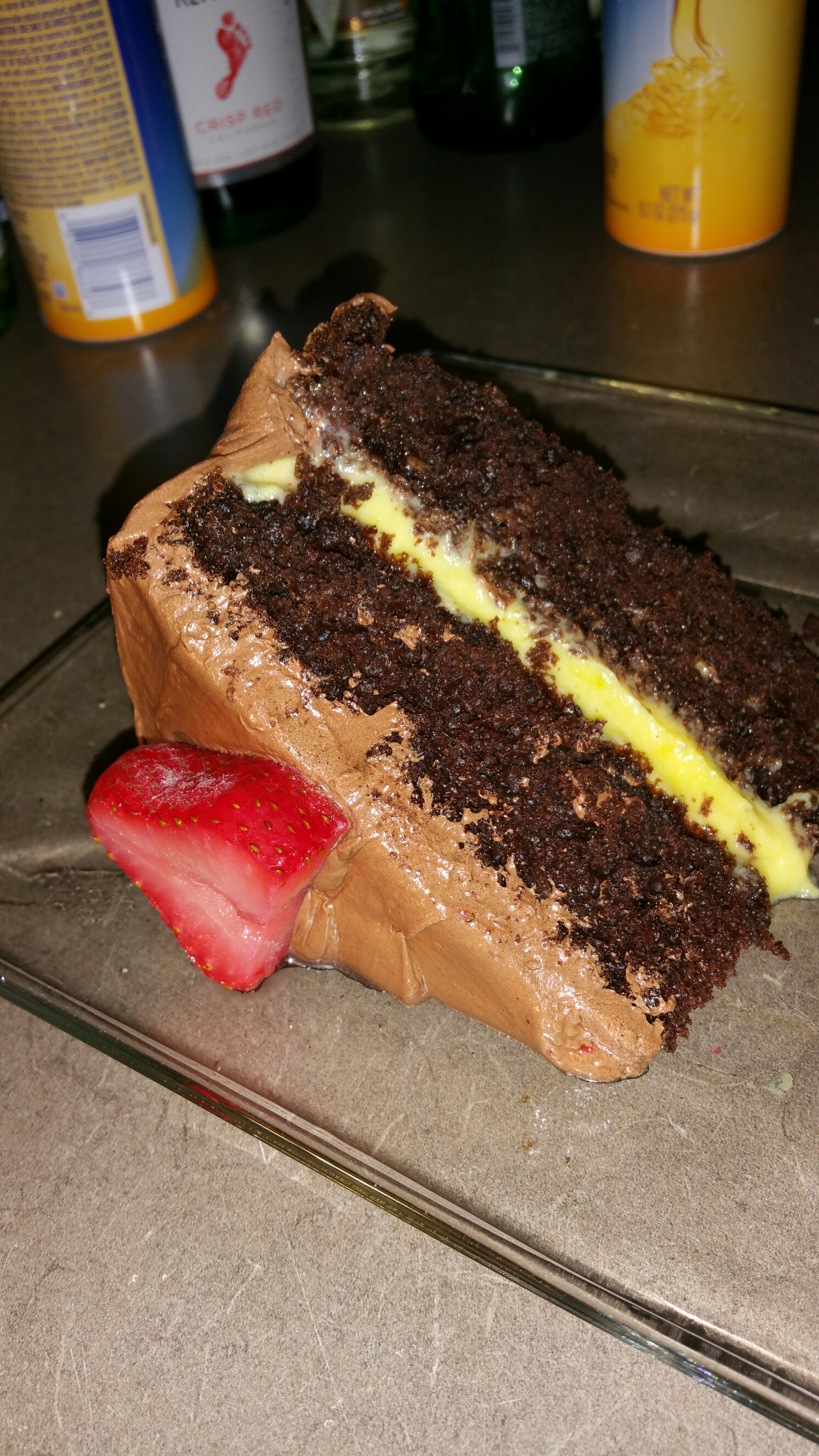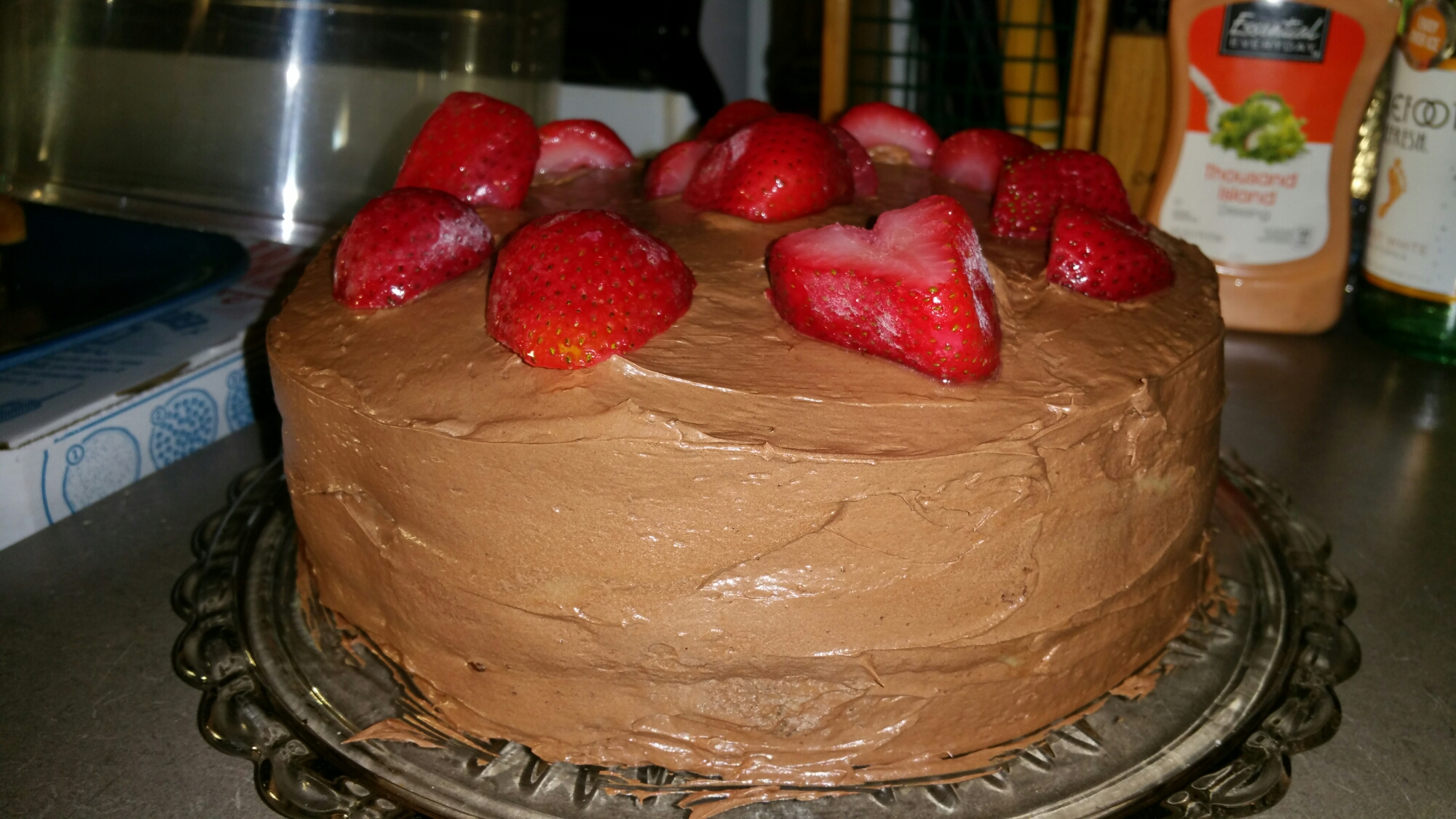 Make cake as directed, using 2-9 inch pans. I used olive oil, instead of vegetable oil, and coconut non stick oil for the pans. No major difference in taste. While the cake is baking, get the pudding made. Let the cake cool. Take one cake and place on plate/cake plate. Spread pudding on that layer. Making sure it’s flat, add sliced strawberries. Add other cake layer. Make sure to flattened the cake, and remove excess pudding. Ice the sides first! Make sure to cover any poenings on the sides, and smooth out the icing, making the icing even. Ice the top of the cake, and finish the cake of by adding the remaining strawberries.