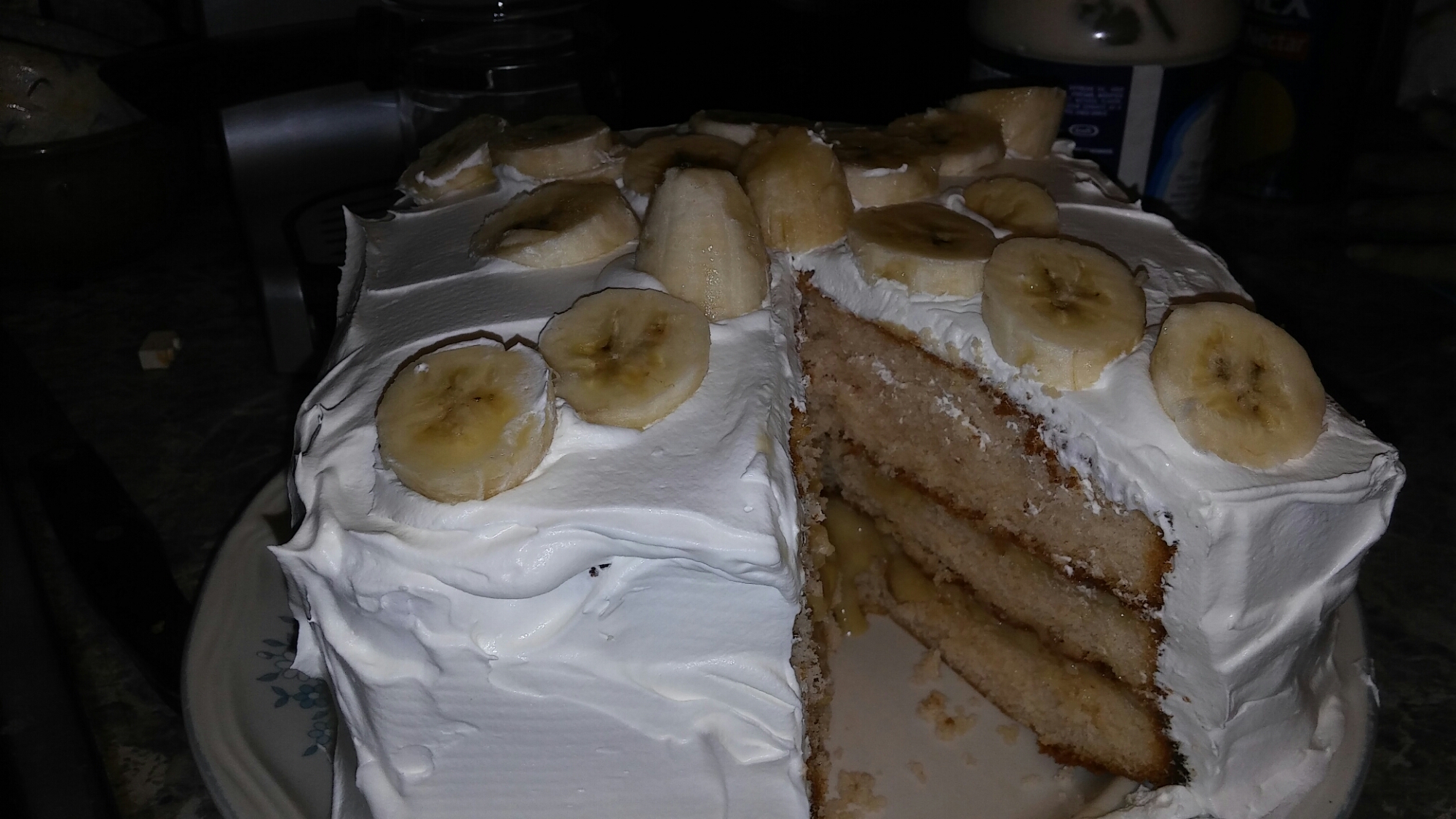 I decided to flost the cake with cool whip, and decided to periscope while frosting the cake! It was interesting. Go check out the video, it’s hilarious. I covered the cake in cool whip, and decorated the top with banana slices. It was a hit! I got 2 for 2 today!